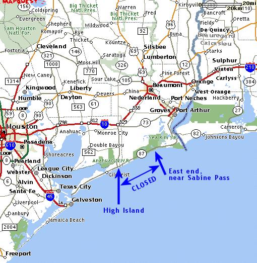 McFaddin Refuge and Sea Rim State Park. See the arrow and that road (Highway 87) ? I took the pictures (right and below) of that area just three weeks earlierl. |