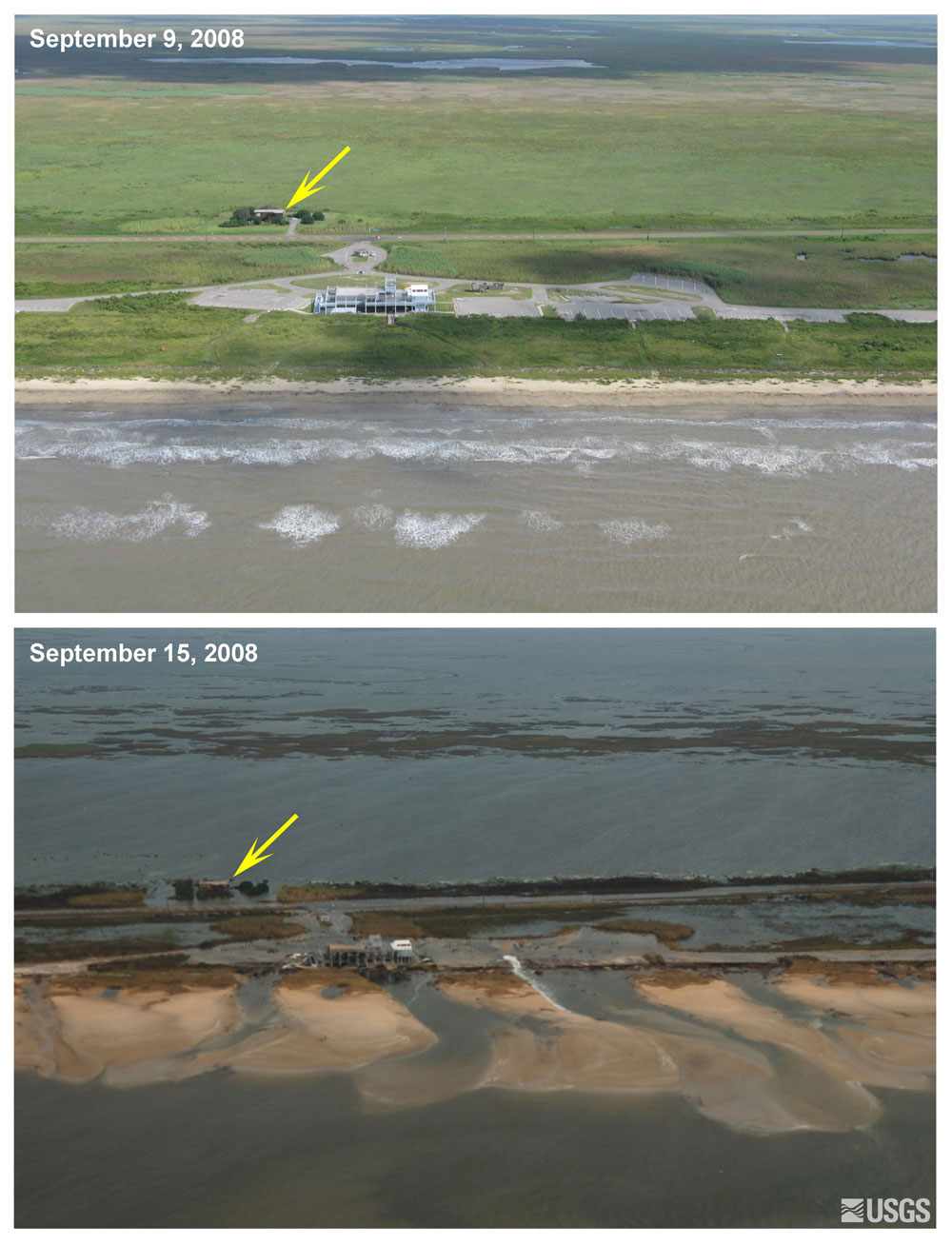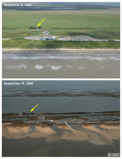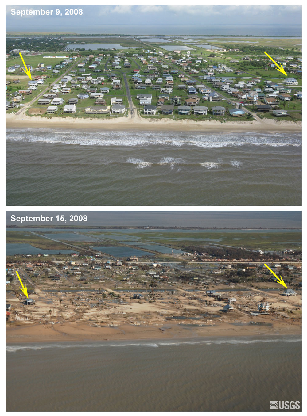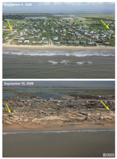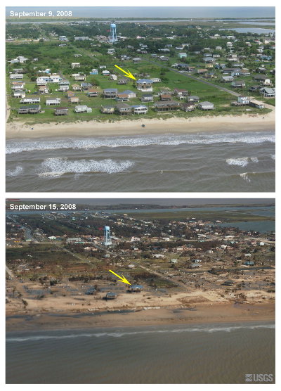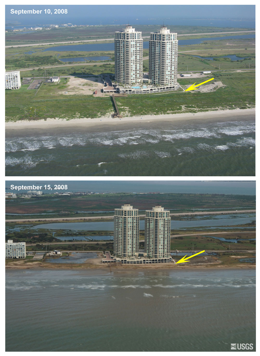 Rather dramatic before and after of non-protected beach east of the Galveston seawall. These condos lost 50 yards of property! The eye of the hurricane passed only a few miles west of this location. |