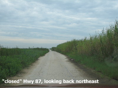 Pictured above, Highway 87 abruptly ends here just after the entrance to the McFaddin Refuge. "Road Closed" signs are posted, but you can drive down the road a few more miles. |