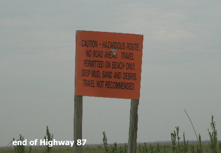 A few folks have made the 20 mile long beach drive to where Highway 87 picks up again near High Island and Galveston. You'll need a 4x4 and about two hours and be prepared to get stuck! |