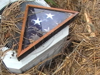 | 1. We surprised my Mother by bringing her Grand-dog Mackenzie on the trip. 2. My wife spotted this Alligator Gar trapped from the flooding and dead in a chain-link fence. 3. Deep flood water submerged Navy Park Cemetary in Orange. The results are above. 4. A Bridge City family lost their home but found an American flag. It's unknown where the flag floated in from. |